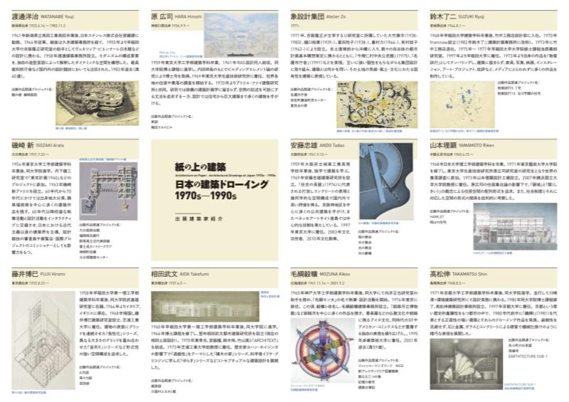 これが「紙の上の建築」展のチラシです(Fig.2)。ここに挙がっているのは、建築家の渡邊洋治、磯崎新、藤井博巳、原広司、相田武文、象設計集団、安藤忠雄、毛綱毅曠、鈴木了二、山本理顕、高松伸です。展覧会に足を運んでくださった方もいるかと思いますが、まずは簡単にこの展覧会の説明をしたいと思います。 |